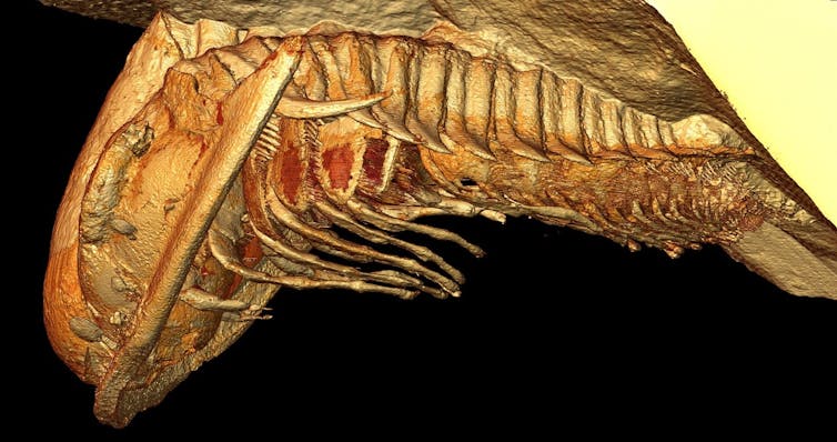 Grâce à une technique d’imagerie, la microtomographie de rayons X, nous avons pu étudier les fossiles en 3D sans les extraire de leur gangue. Cette technique se base sur la propriété des rayons X à traverser la matière et à être absorbés en fonction de la nature et de la densité des constituants qu’ils rencontrent. En remplissant numériquement leur moule, les corps disparus ont été reconstitués avec un niveau de détails saisissant.